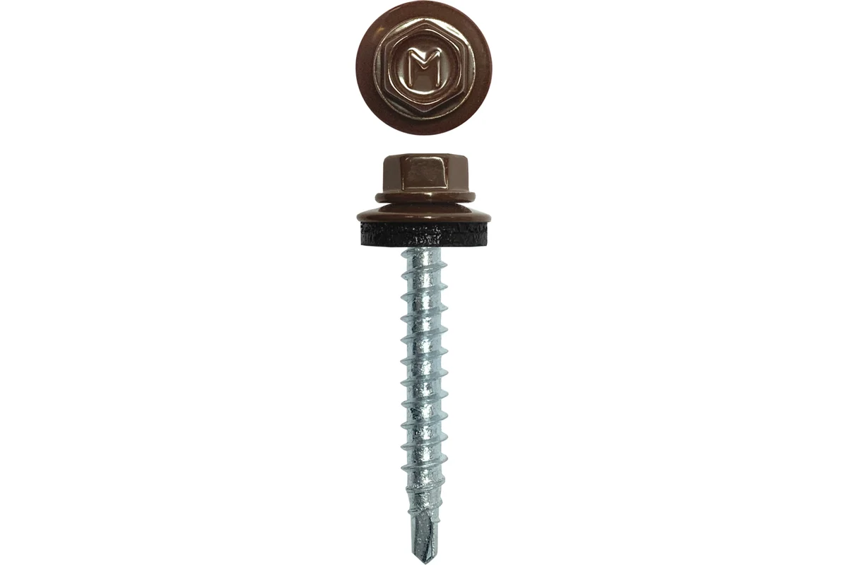 Кровельный саморез Daxmer 4,8х35 RAL 8017 250 шт. 303943 представляет собой крепежное соединение для плотного монтажа металлического профиля к деревянной обрешетке. Стальной саморез имеет цинковое антикоррозийное покрытие. Головка с внешним шестигранником маркирована буквой "М" и обладает EPDM-уплотнителем толщиной 2.5 мм.