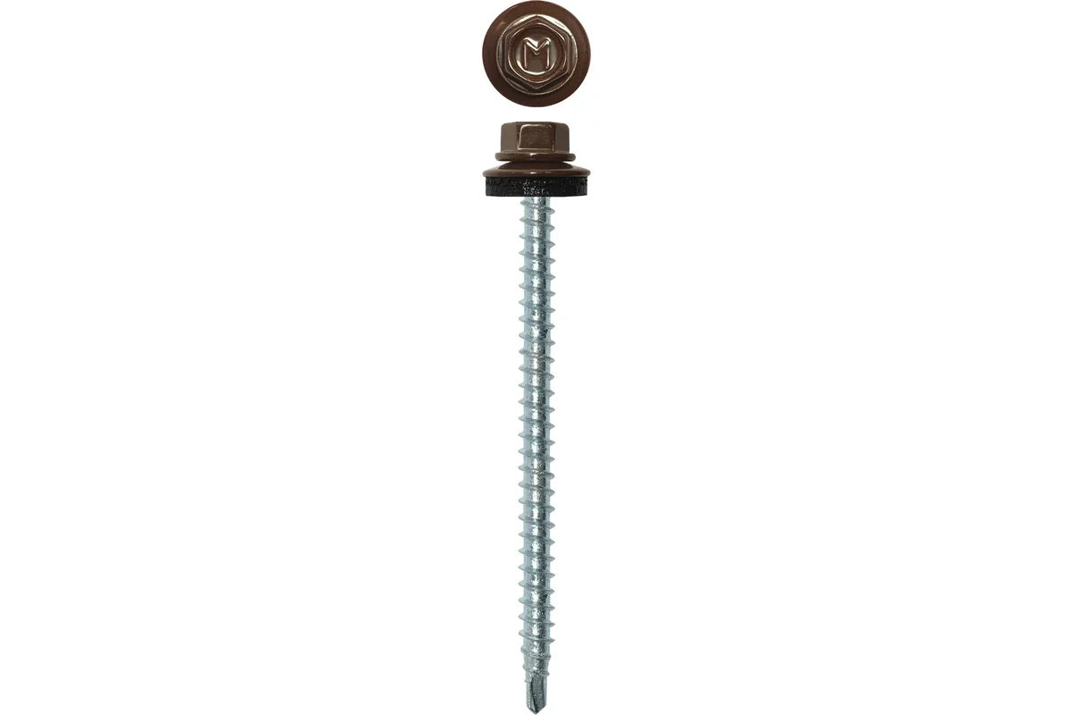Кровельный саморез Daxmer 4,8х70 RAL 8017 100 шт. предназначен для присоединения профилированного металла к деревянной обрешетке. Изделие состоит из резьбовой оцинкованной части и шестигранной головки с ЕРDМ-уплотнителем, выкрашенной в шоколадно-коричневый цвет полиэфирной краской.